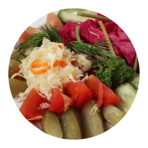 Соления ассорти (квашеная капуста, соленые огурчики, маринованный чеснок); горячая закуска в ассортименте, рулетики из баклажанов или др.;